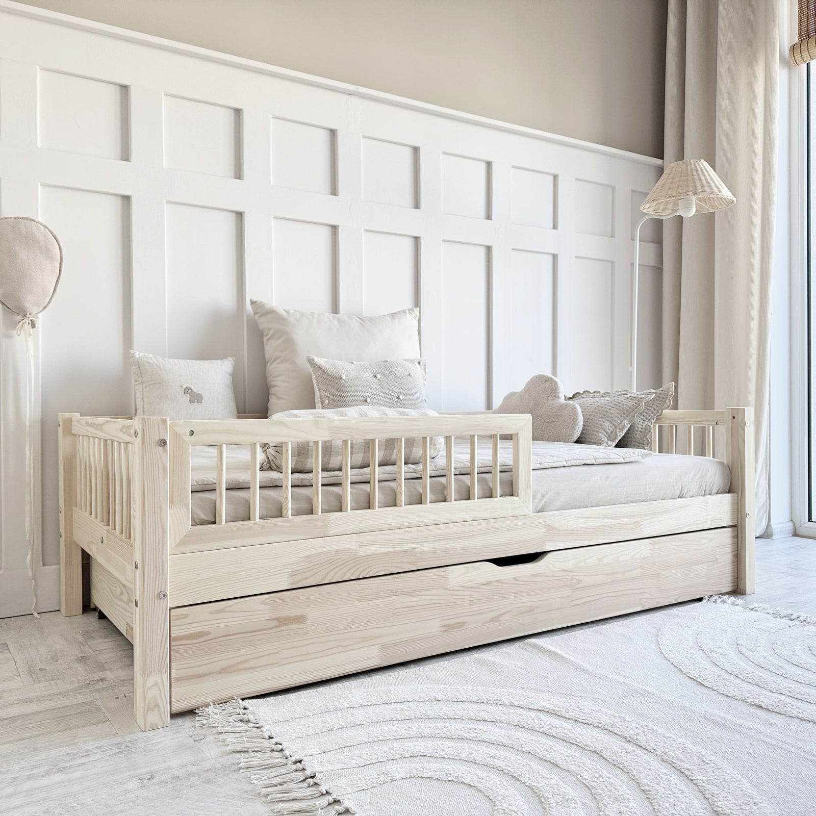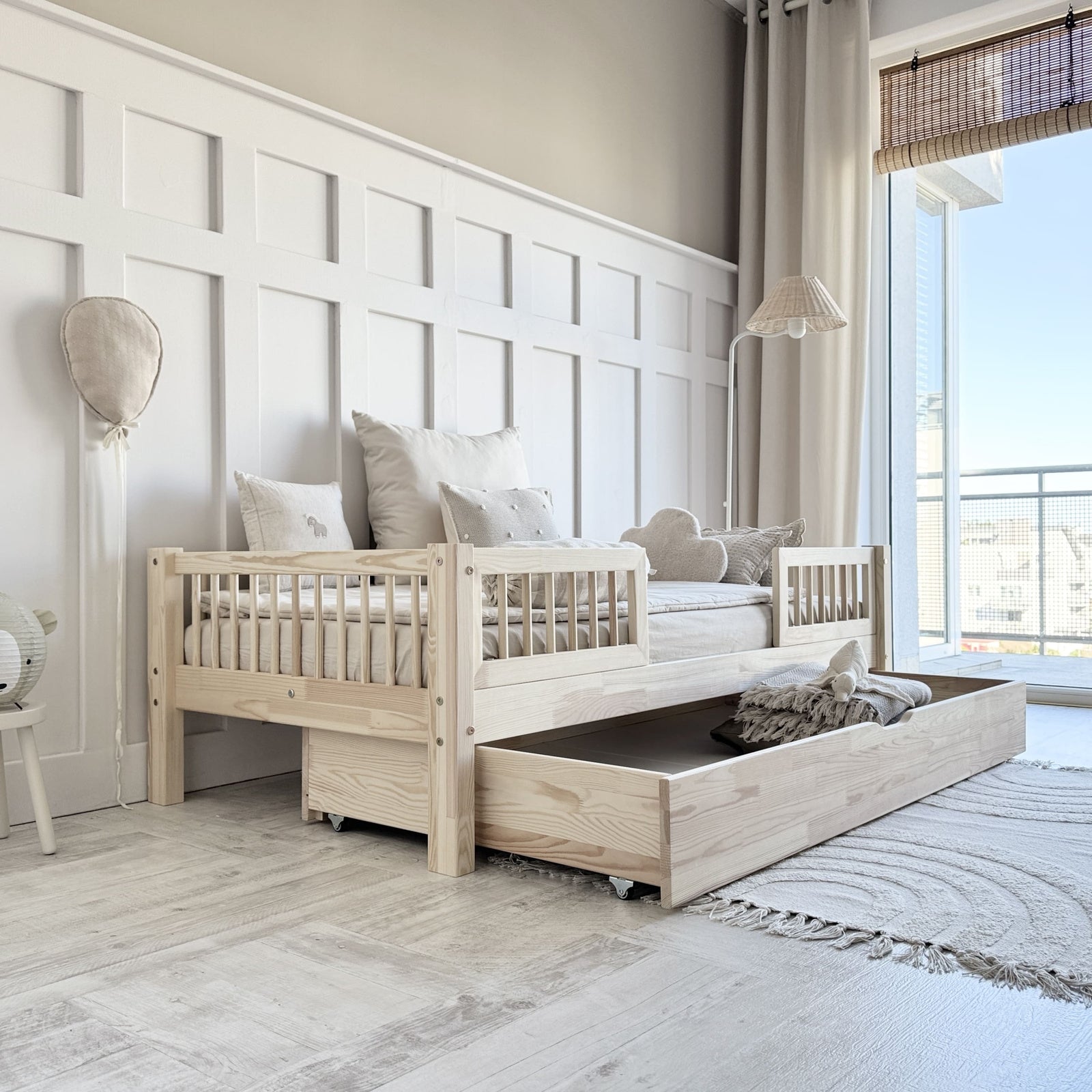 At Cubbly, we understand that choosing a child’s bed is a big decision. That’s why we focus on the things that matter most to parents: safety, quality, comfort, and longevity. Our beds are made-to-order using premium European pine wood — thicker, stronger, and far more durable than mass-produced alternatives. We offer a wide choice of natural finishes and child-safe paints, along with clever features like removable, configurable guard rails and optional underbed storage or trundle drawers.